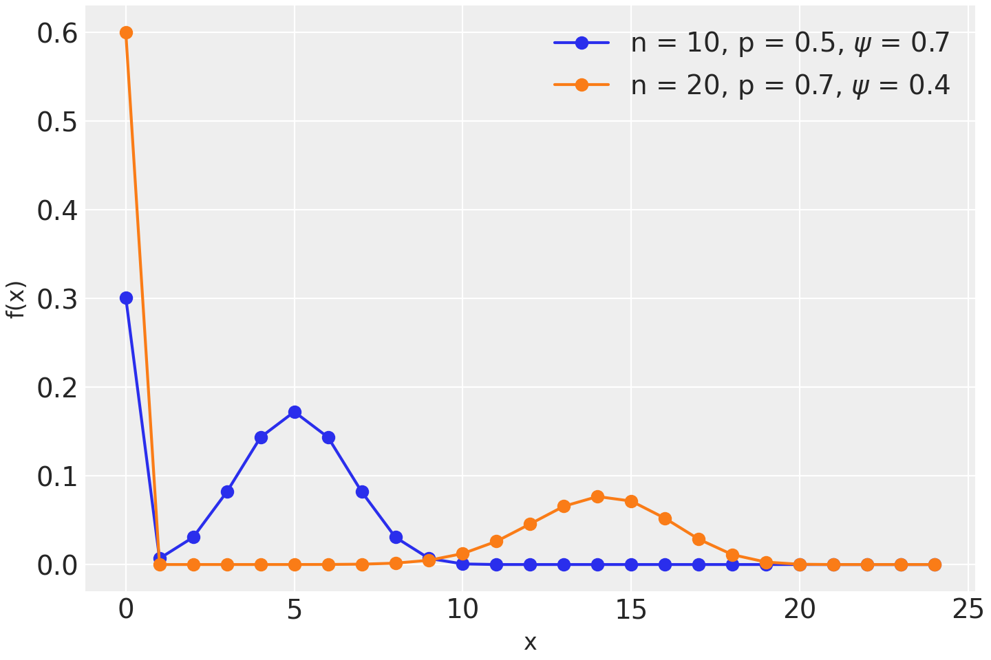 \[\begin{split}f(x \mid \psi, n, p) = \left\{ \begin{array}{l} (1-\psi) + \psi (1-p)^{n}, \text{if } x = 0 \\ \psi {n \choose x} p^x (1-p)^{n-x}, \text{if } x=1,2,3,\ldots,n \end{array} \right.\end{split}\]